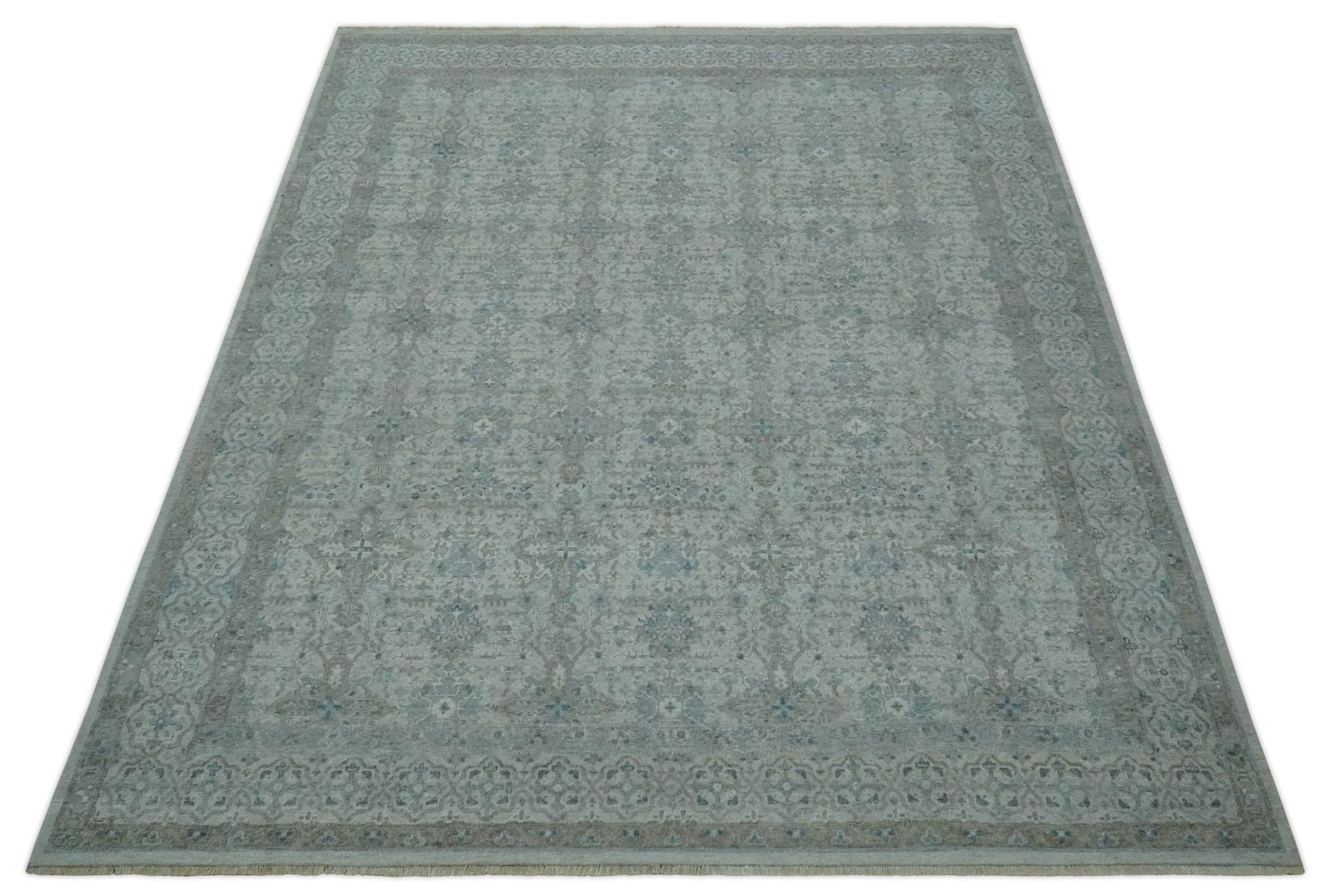 Antique Distress finish Silver, Teal and Brown Hand Knotted Traditional 8x10 wool Rug
