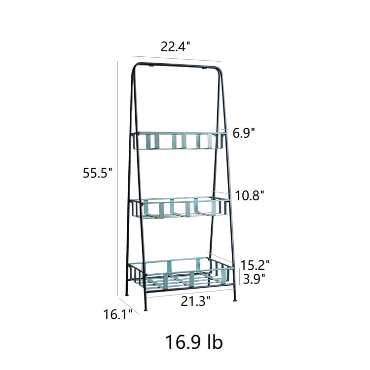 Crafted from iron metal and painted a vintage shade of blue/green with a beautiful washed patina to it, this triple tier self standing tabletop unit neatly and charmingly displays a variety of things. Use the 3 metal basket shelves to store linens, toiletries, books, craft supplies, sewing essentials or party favors.