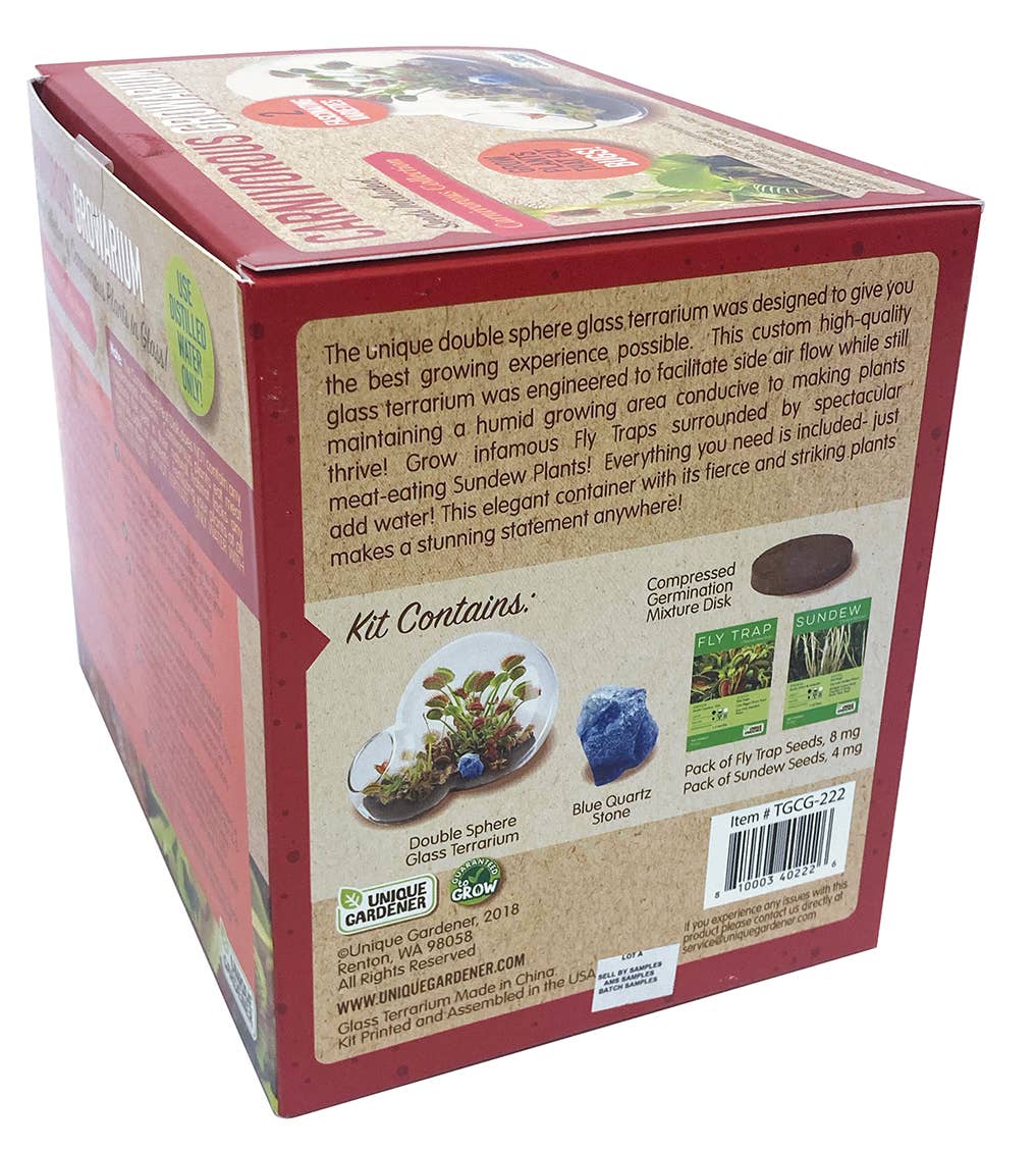 The unique double sphere glass terrarium was designed to give you the best growing experience possible. This custom high-quality glass terrarium was engineered to facilitate side air flow while still maintaining a humid growing area conducive to making plants thrive! Grow infamous Fly Traps surrounded by spectacular meat-eating Sundew Plants! Everything you need is included- just add water! This elegant container with its fierce and striking plants makes a stunning statement anywhere!