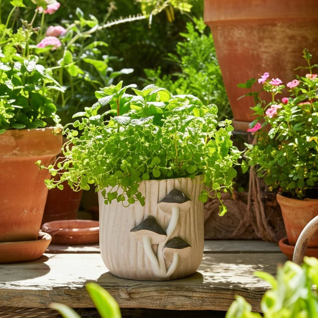 • Here are five compelling and SEO-optimized bullet points for your Amazon listing:UNIQUE MUSHROOM DESIGN - Elevate your home decor with this charming pottery planter featuring a rustic tree trunk texture and whimsical mushroom accents. Perfect for adding a touch of nature-inspired beauty to your indoor or outdoor plant display.