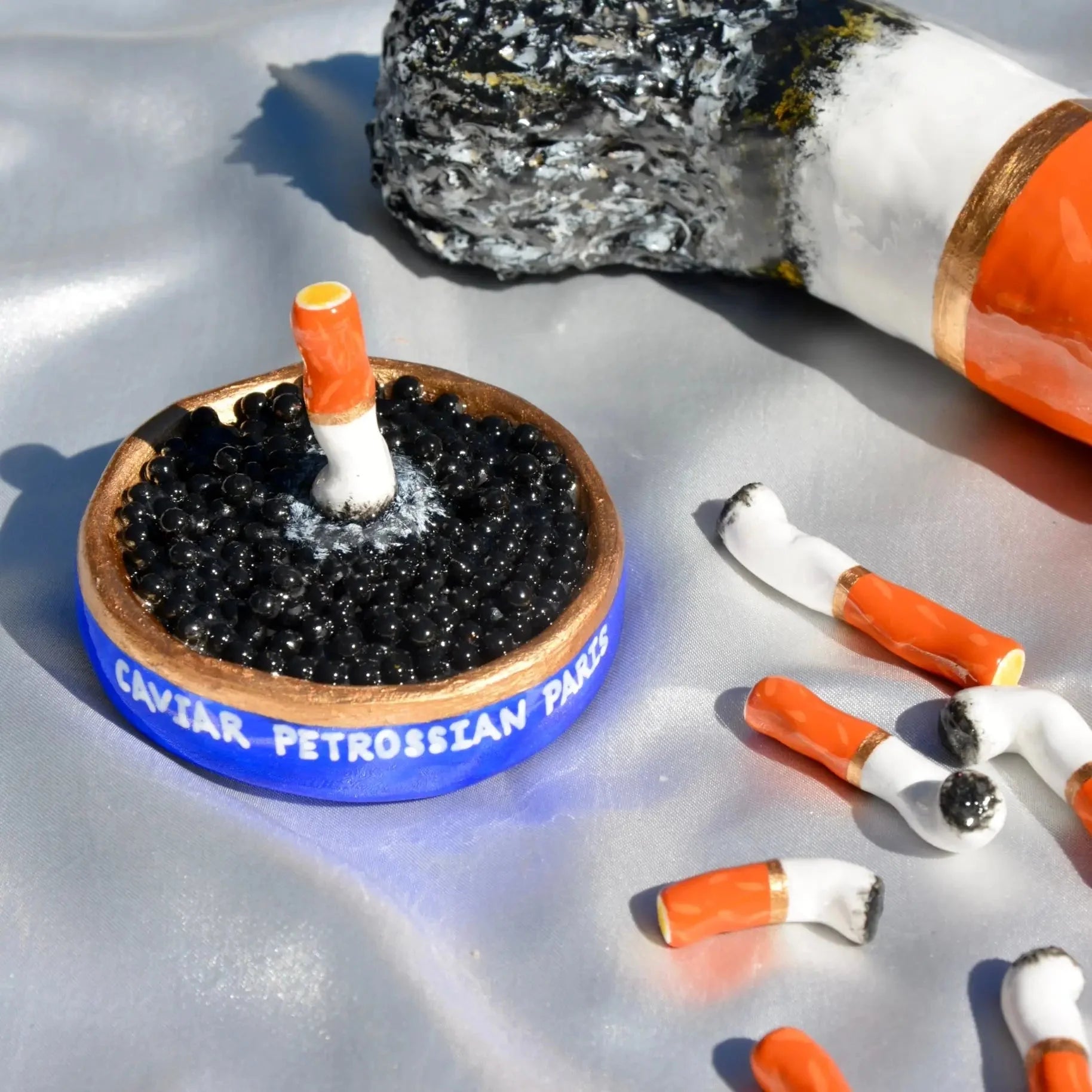Cigs N' Caviar, one of our bestsellers, features individually hand-rolled caviar “pearls” and a crinkled burnt cigarette outfitted with real ashes. The perfect statement piece for a classy, yet Savage imagination.