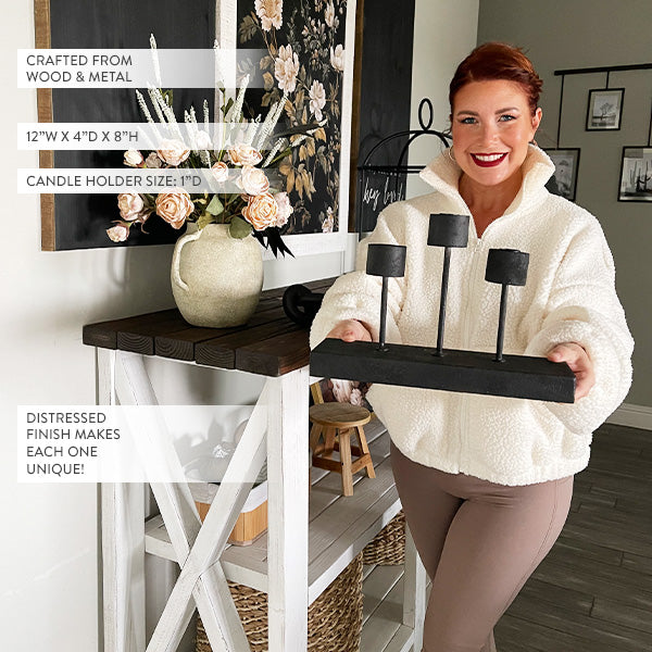 Come on, baby, light my fire with the Distressed Black Metal Candle Holder! This timeless piece effortlessly blends rustic charm with modern farmhouse appeal. Designed to hold 1-inch diameter candles, it’s perfect for setting the mood as a centerpiece or accent piece. Add warmth and ambiance to any room with this stylish and versatile decor must-have.