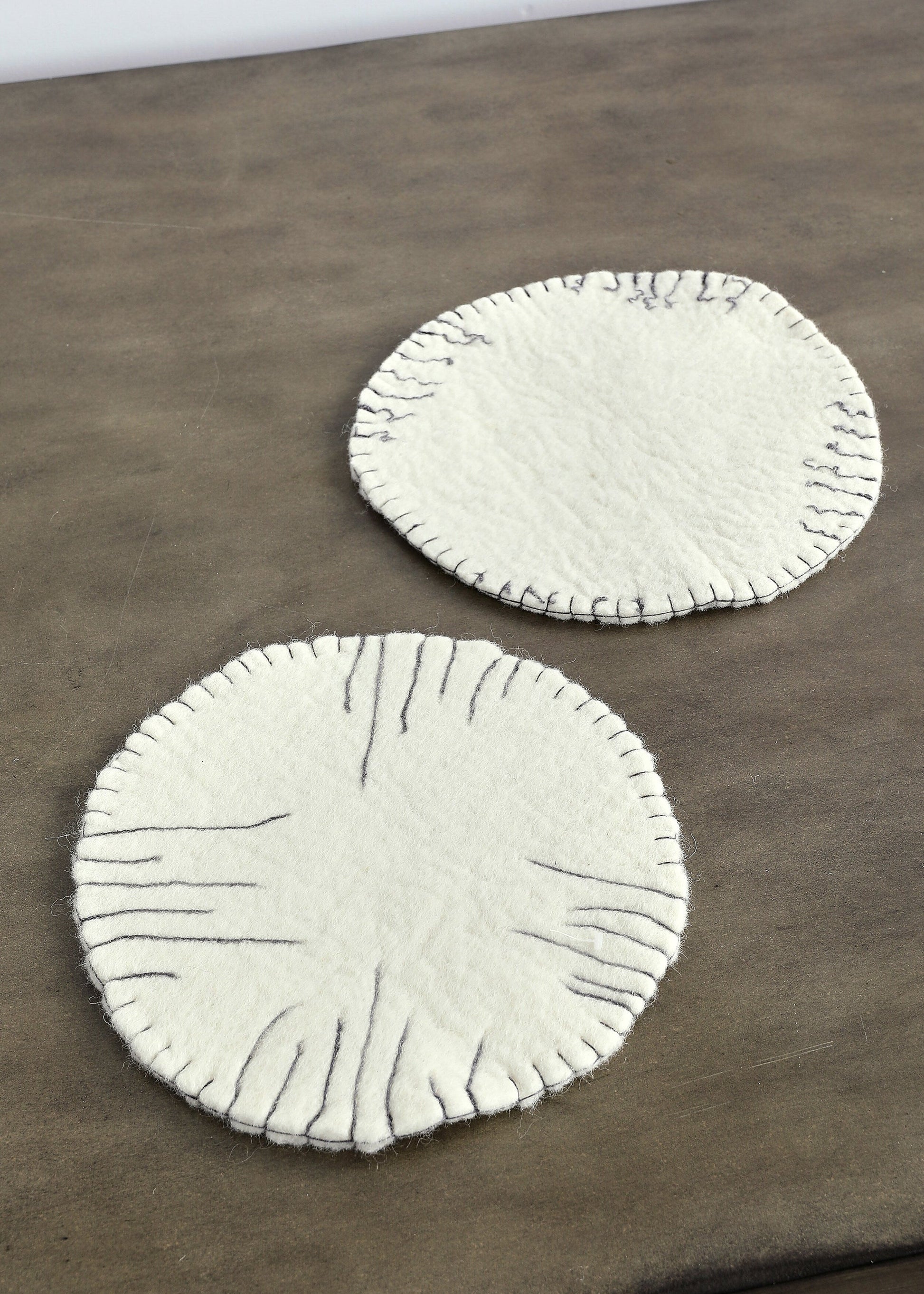 Indulge in the exquisite craftsmanship of our Fine Line Trivets. Hand felted with 100% merino wool and adorned with recycled silk and mohair yarns, these bespoke trivets offer a delightful softness. With their half-inch thickness, they provide plush protection against heat and scratches, all while adding a touch of modern decor and warmth to your tablescape. A perfect complement to intricate or colorful tableware, these one-of-a-kind trivets are proudly created by an all-female artisan group in Cape Town.