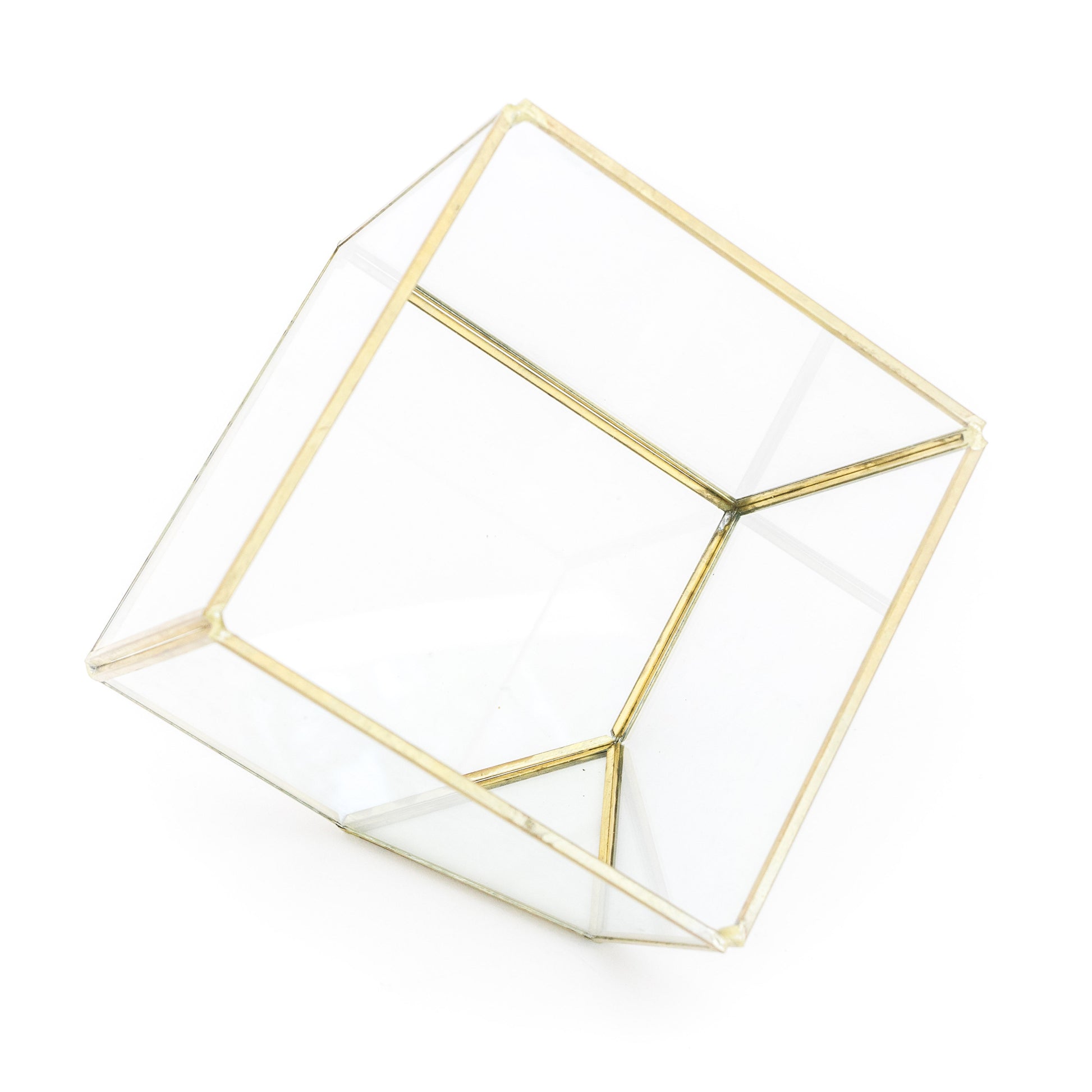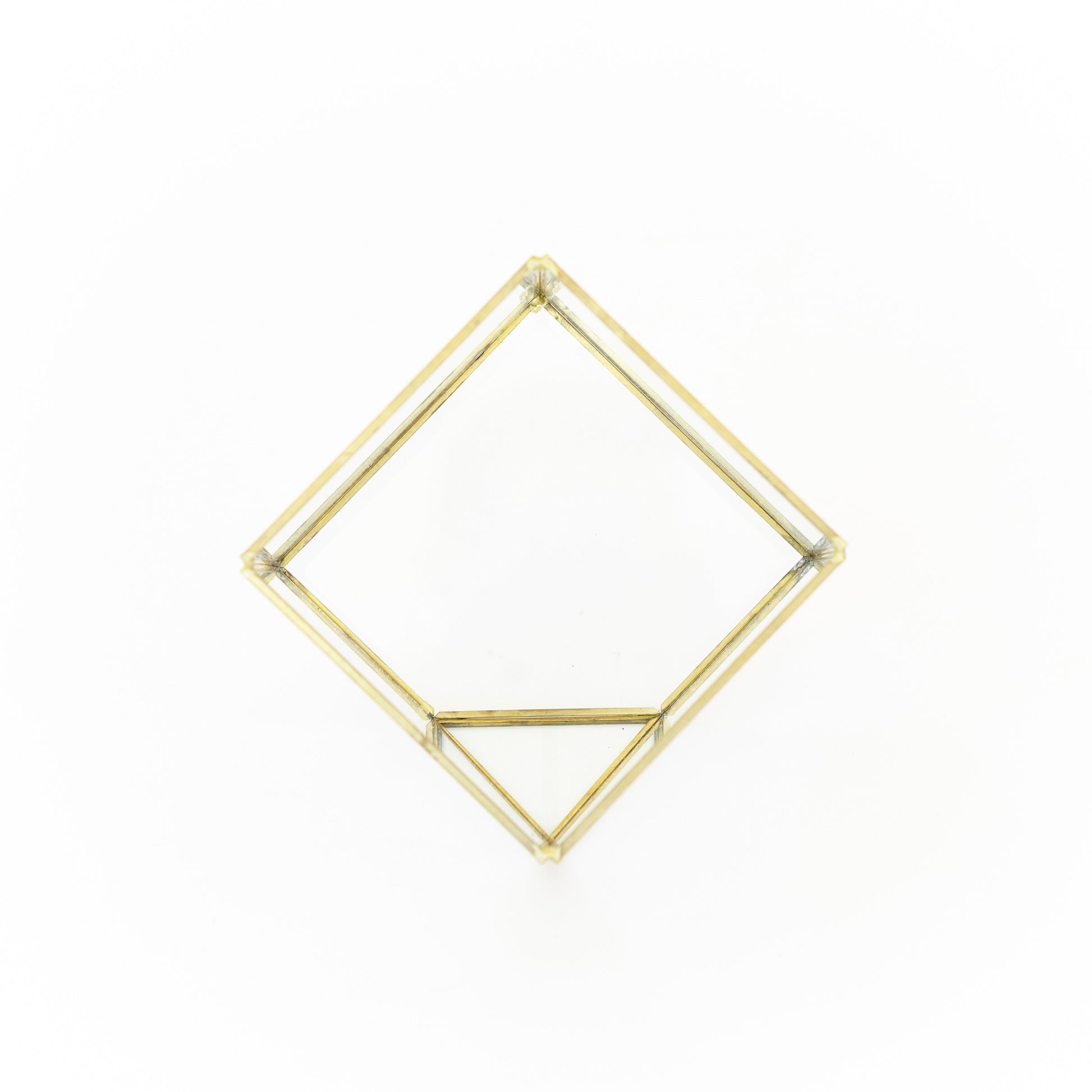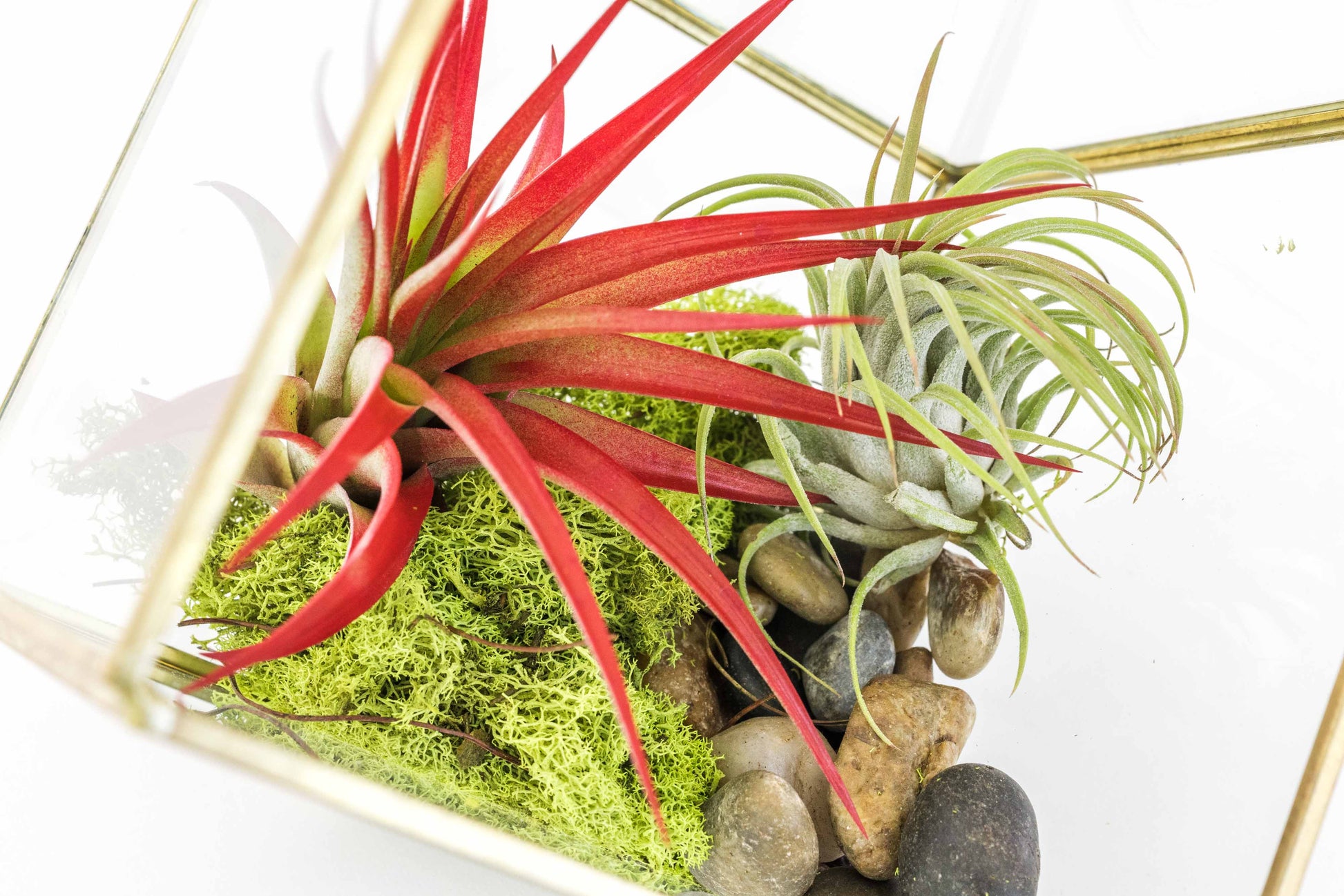 A seven-sided, gold-plated terrarium with Tillandsia Red Abdita, Ionantha, River Rocks, and Reindeer Moss. Sits beautifully on its triangular base for your home or workspace. Also makes a perfect gift!