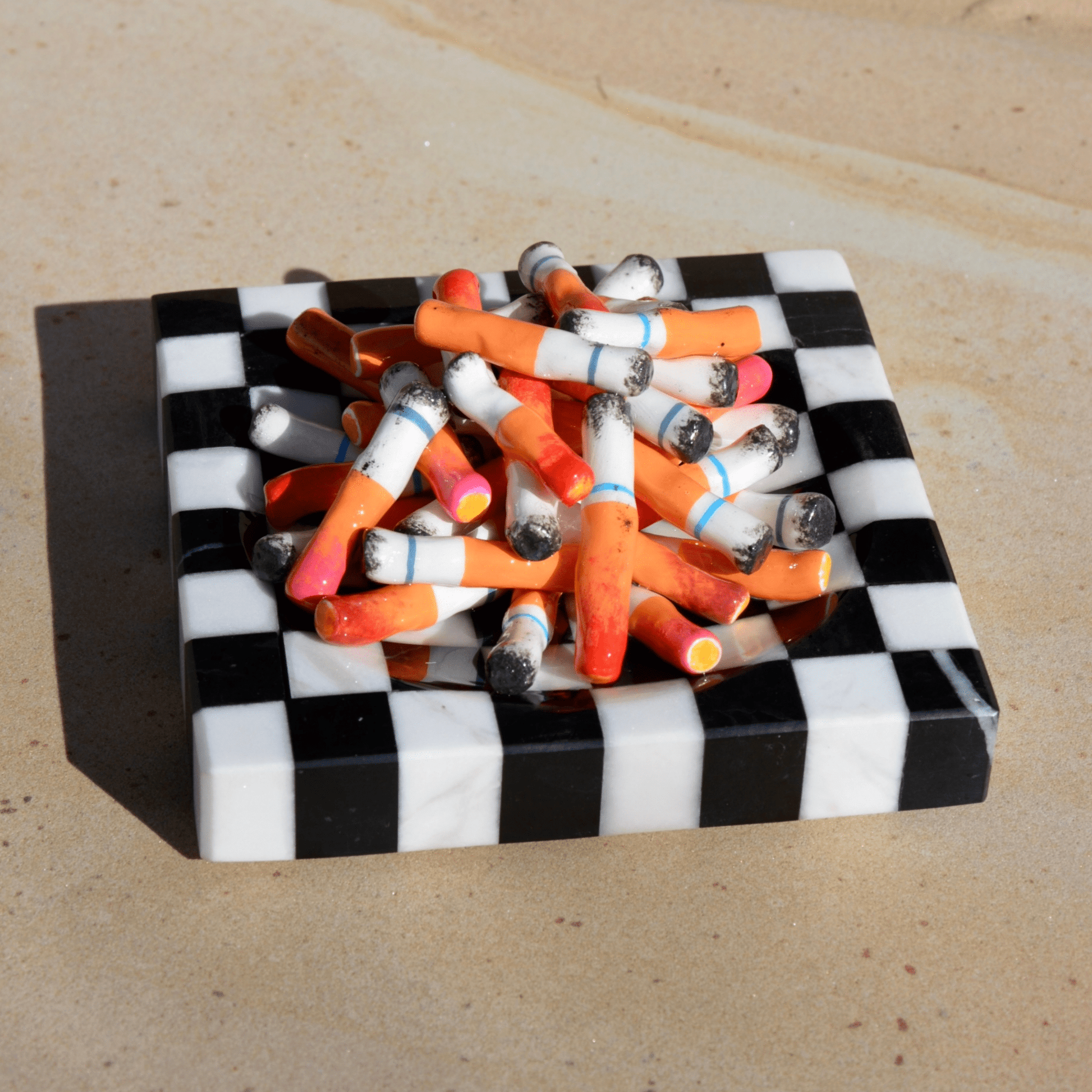 Introducing Kiss my Ash… A clash of vice and vanity. Featuring a pile of 37 mixed ceramic cigarette butts with various shades of “lipstick” stains and real ashes. Oh, and we can’t forget about the handcrafted marble checkerboard ashtray. Glamour gone up in smoke, if you will.