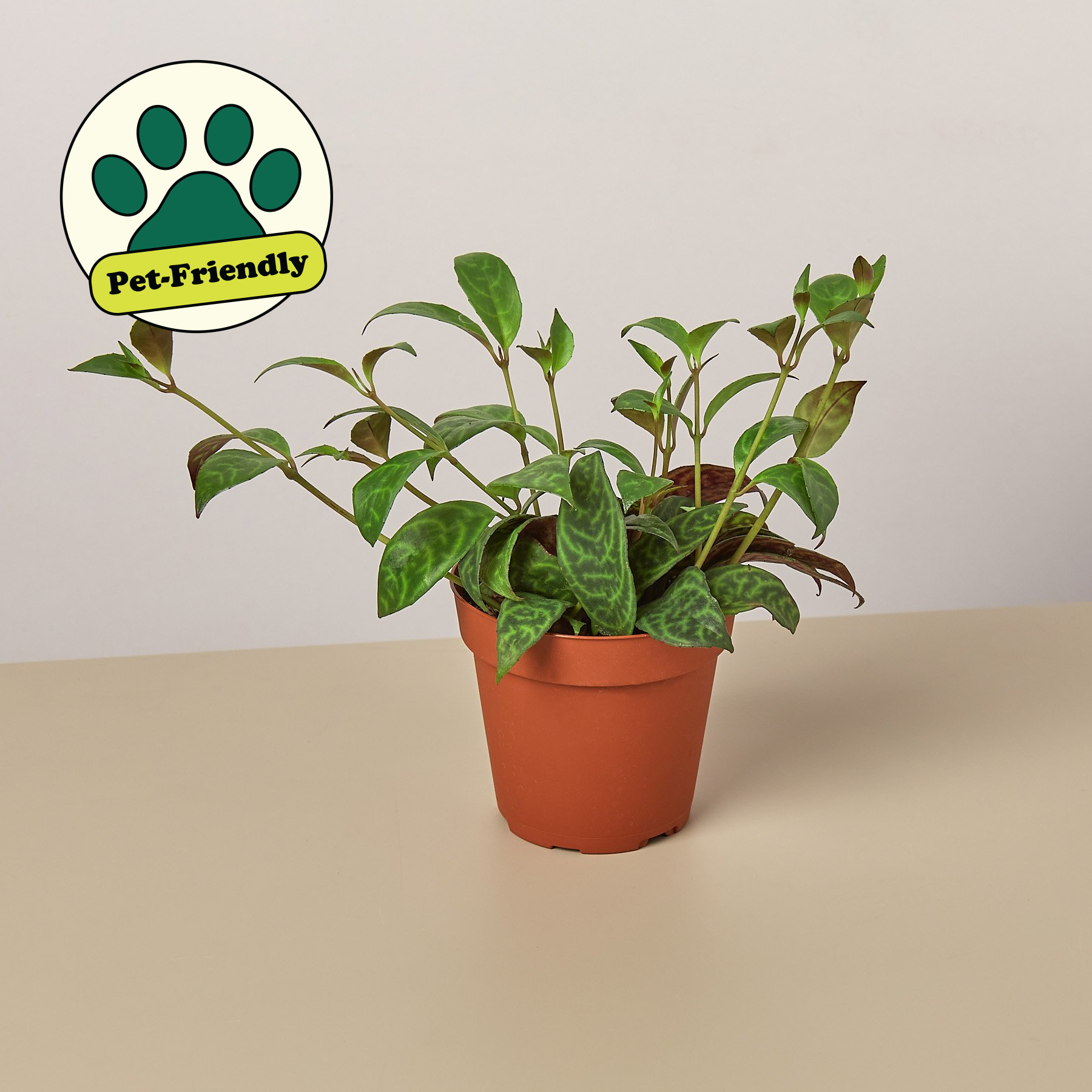 - Description: The black pagoda plant has a mottled, camouflage like foliage that runs along it's cascading stems, making this a great plant for hanging pots. This plant will bloom beautiful orange flowers around late winter to spring but has been known to bloom year-round