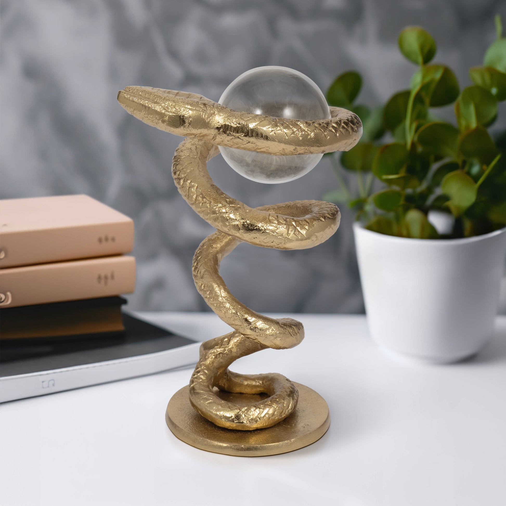 • PREMIUM CRAFTSMANSHIP- Made from high-quality metal with a shimmering finish, this handcrafted sculpture is built to last. The textured snake design and crystal-clear acrylic sphere create a sophisticated look that enhances any space.