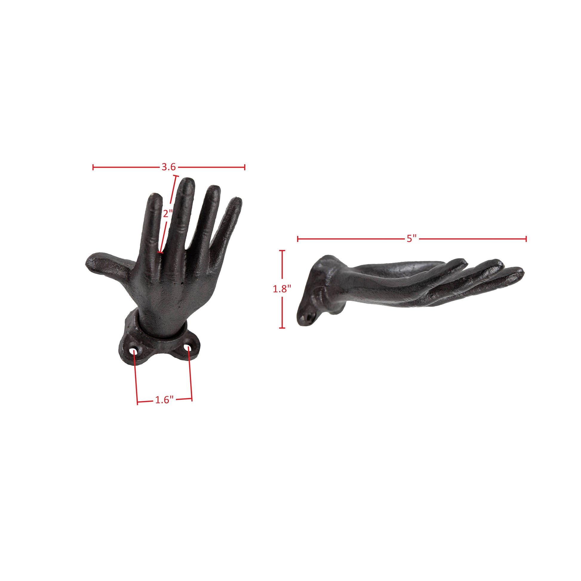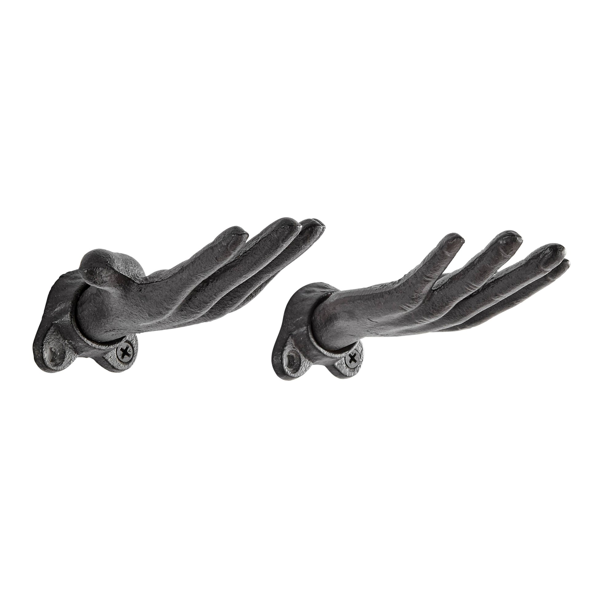 Add a whimsical touch to your living space with the "Palms Up" Dark Brown Cast Iron Wall Mount Hook Set (Set of 2). These eye-catching cast iron wall hooks are masterfully shaped like open hands so you can place items on the palm or hang bags, coats, scarves, hats or keys. Great when hung along entryways to keep your essentials within easy reach, but they'll also look amazing and come handy when displayed in bedrooms, living rooms, kitchens, and bathrooms. And don't forget your closet, where you can keep your jewelry organized and tangle free by hanging your necklaces and bracelets on each finger while the earrings sit on the palms of each hand. Each set comes complete with mounting hardware for easy installation! Talk about getting a hand from your home decor! The "Palms Up" Dark Brown Cast Iron Wall Mount Hook Set (Set of 2) adds some whimsy and charm to your space. These clever hooks are designed to look like open hands, so you can hang your items on the fingers or in the palm.