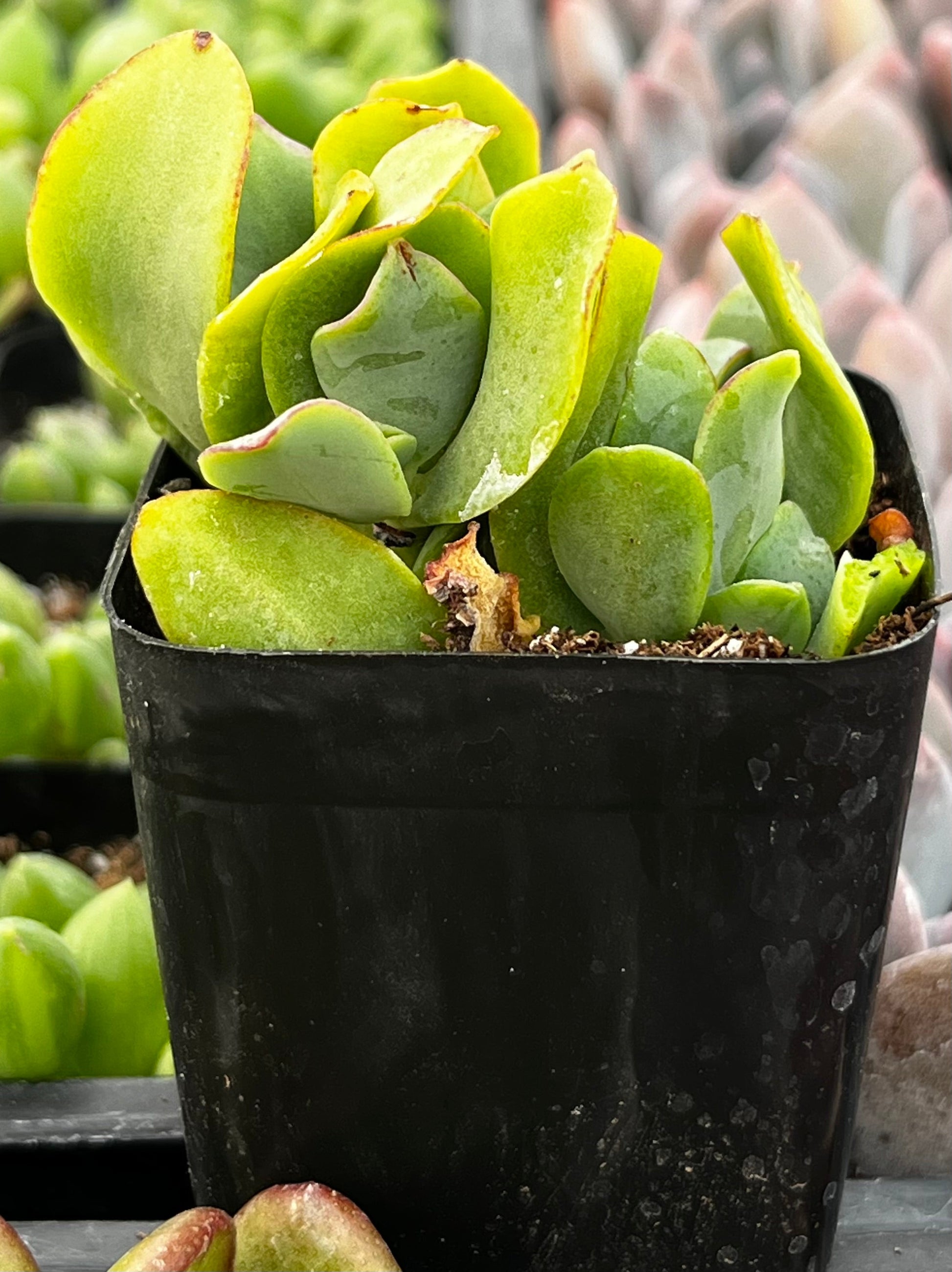 The Ruffle Jade (Crassula arborescens undulatifolia) is a unique and eye-catching succulent known for its wavy, ruffled leaves. Its thick, blue-green foliage has a subtle powdery coating and slightly curled edges, giving it a dynamic and sculptural appearance. As it matures, this slow-growing plant develops a sturdy, upright form, making it a standout in any collection.