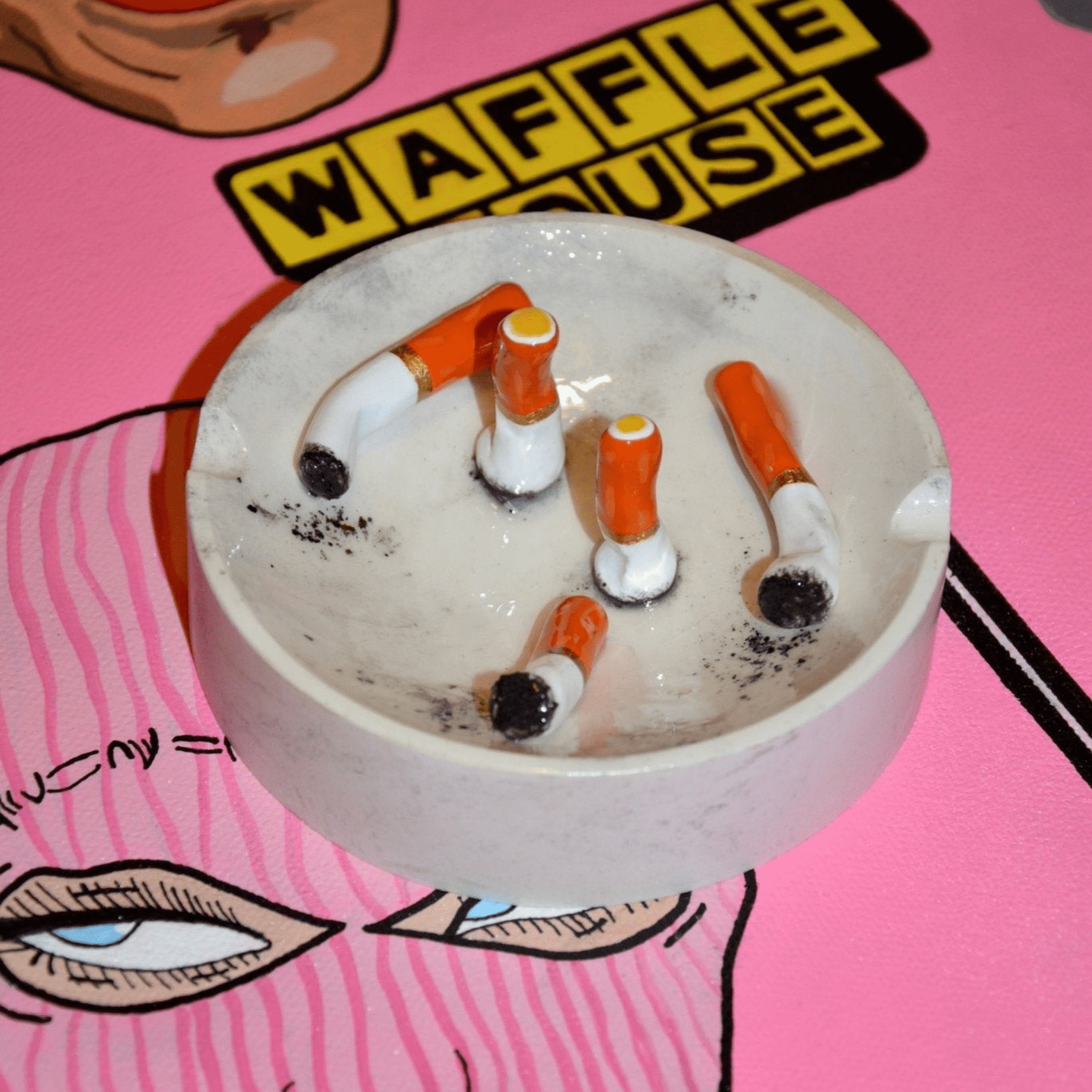 - Materials: Heavy duty plaster vessel/Ceramic cigarettes/Gold leaf/Real ashes/Protective gloss coating