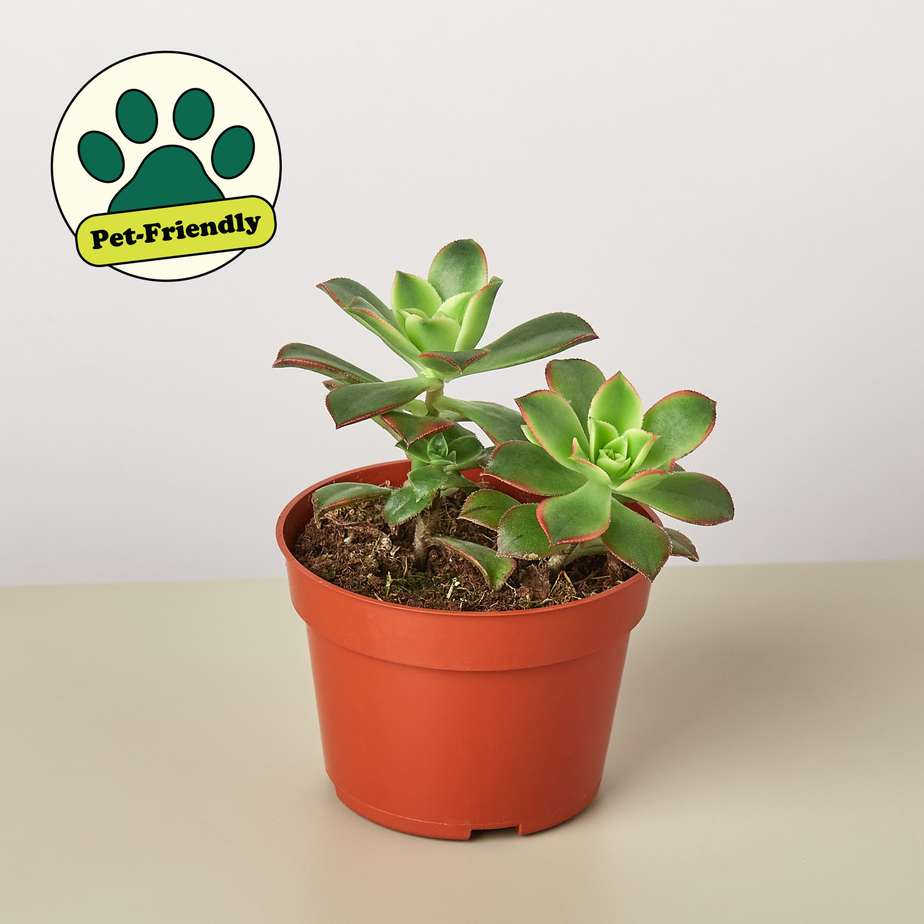 Description: This vibrant, colorful succulent grows quickly and easily. It has a few peculiarities not shared by other succulents, such as an aversion to very hot, dry weather and the desire for a bit more water. With a little bit of sun, these gorgeous succulents display leaves that start yellow and darken into green, the edges of the leaf bordered with pink or red. During the late summer, they occasionally produce large, yellow flowers. Kiwi Aeonium is a monocarp, so it dies after flowering.