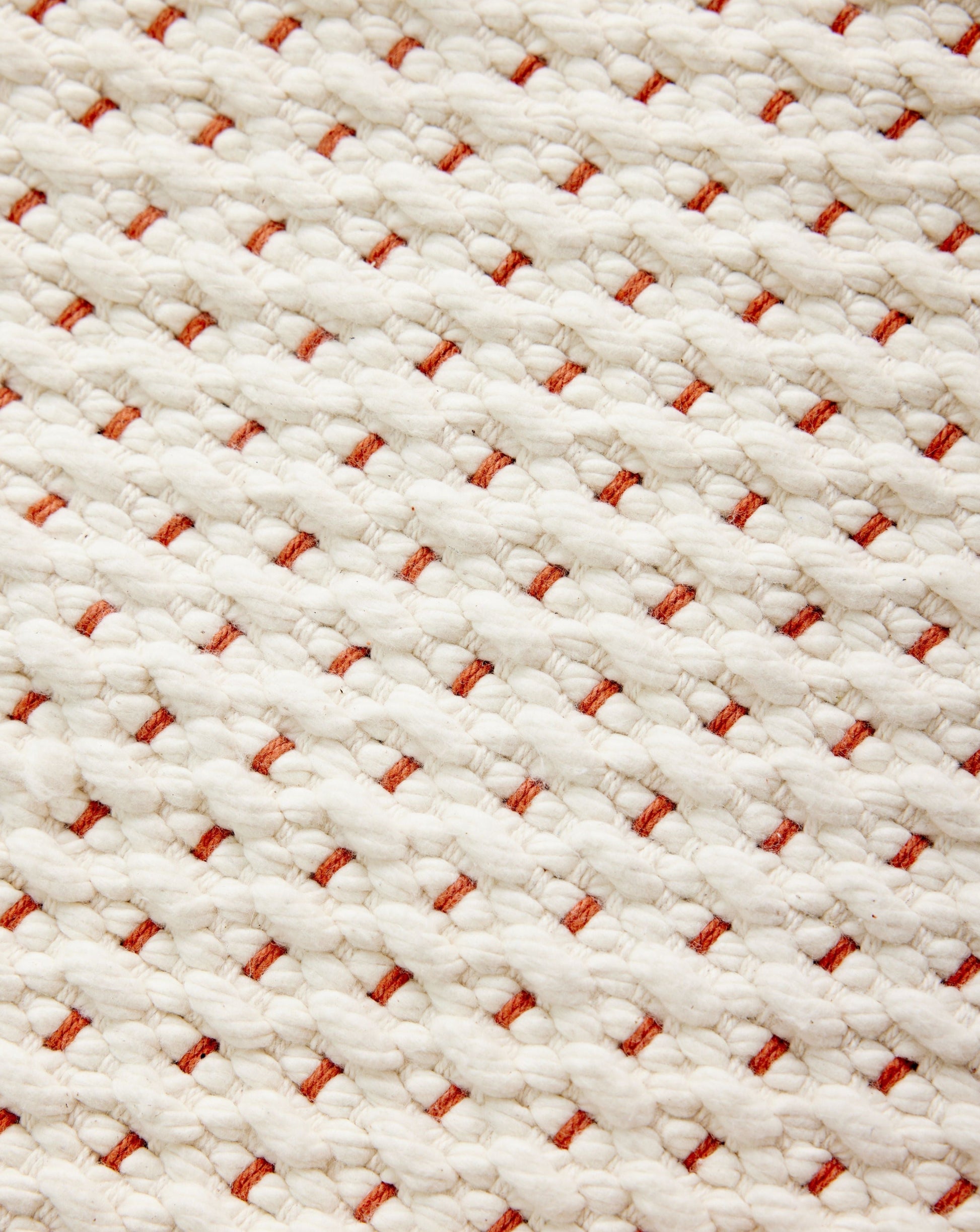 Experience the epitome of style and comfort with this chic terracotta-accented cotton rug. Meticulously handwoven, the natural background harmoniously complements the captivating Terracotta pin stripe, making it a luxurious accent for your home. Versatile and elegant, this rug is perfect for enhancing any space with its premium quality and eye-catching design. Scan the Q-code on the tags to see the artisan weaver who created your specific piece.