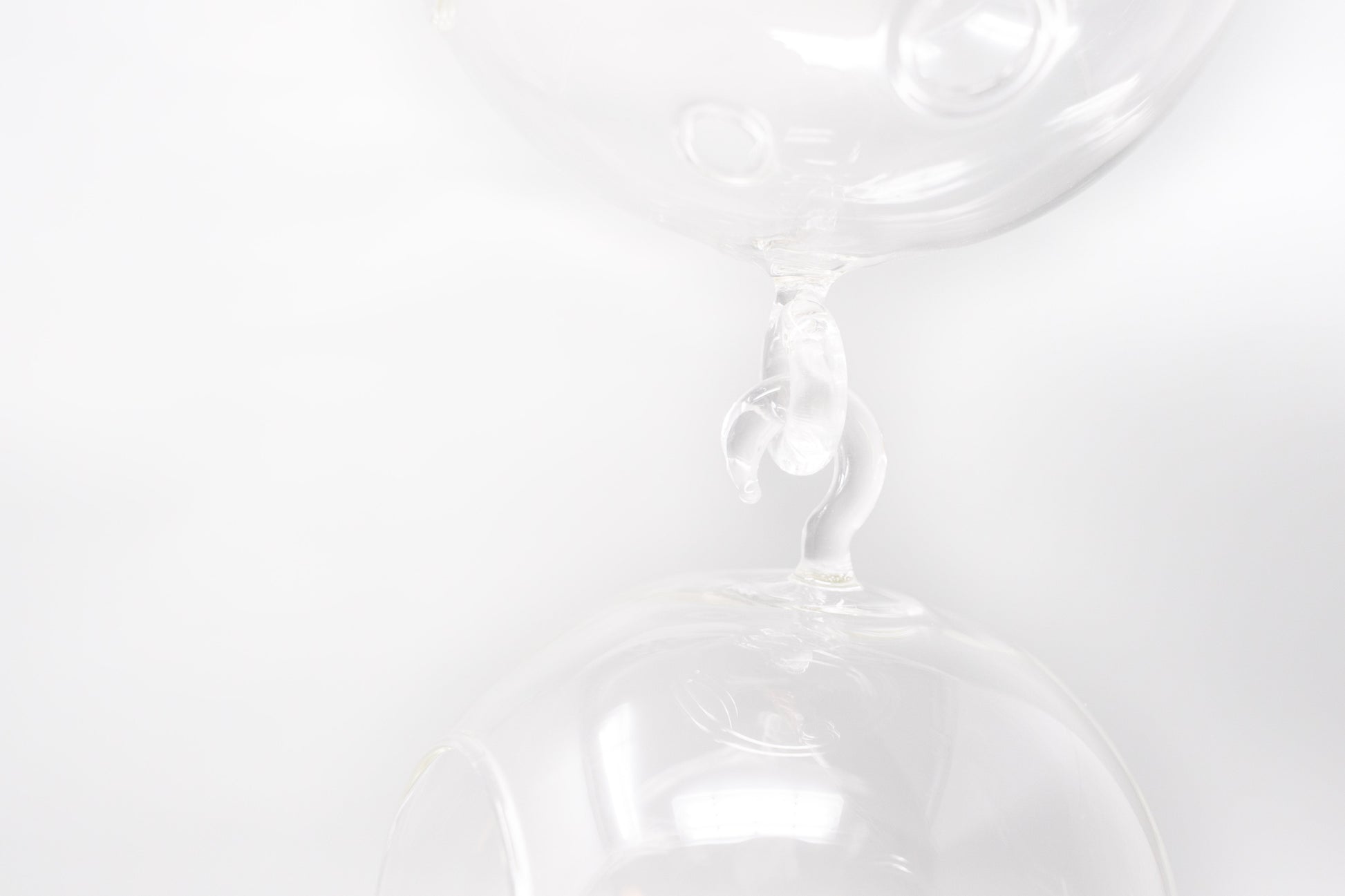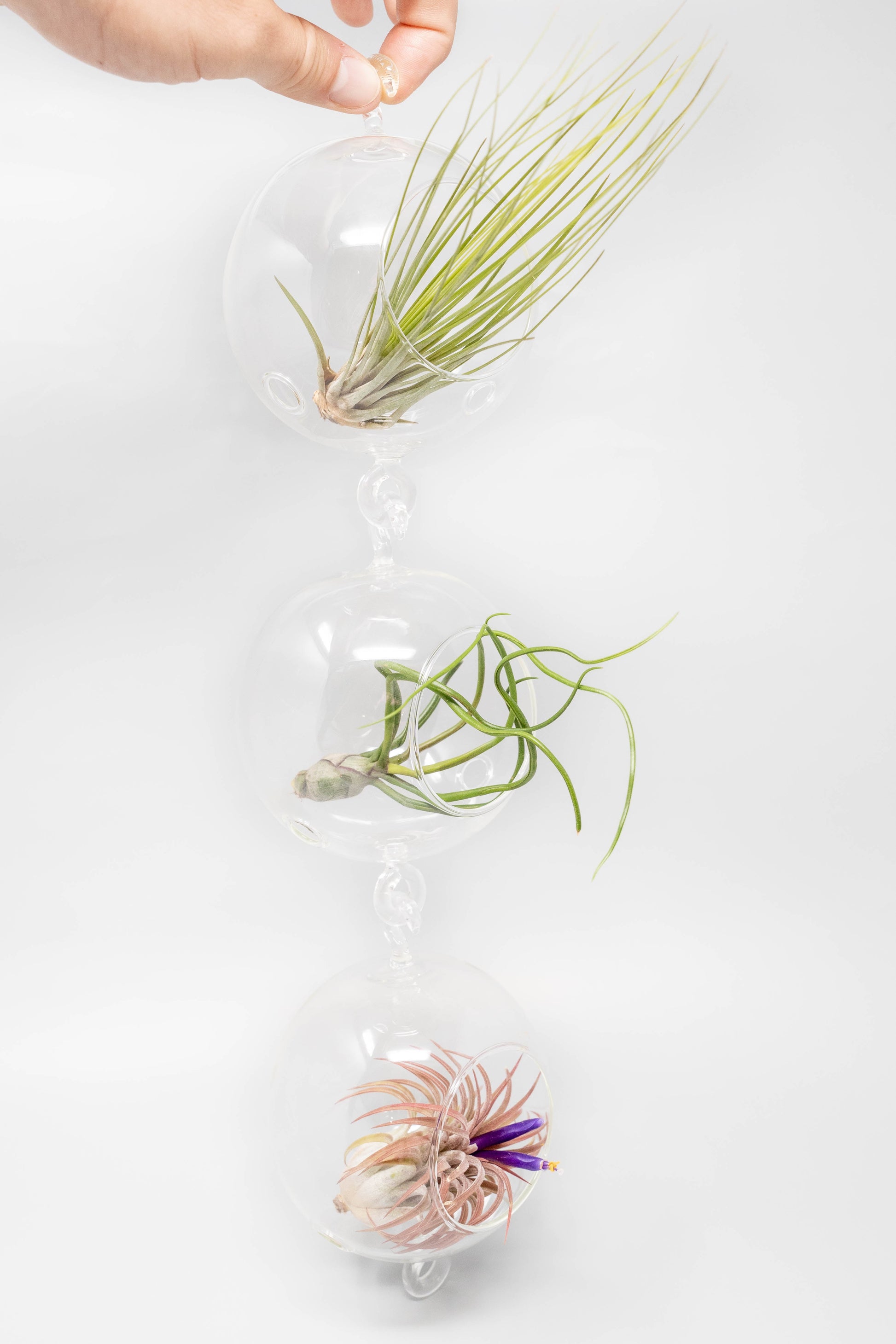 A set of 6 glass terrariums with double hooks and air plants that can be hung in a vertical chain. Each air plant is arranged in its own glass orb free of other accents so one can observe each plants' unique leaf structure from all angles. Each globe has a glass hook and loop so that they are easy to place and are interchangeable. The terrariums can be hung together to create a beautiful floating chain. This minimalist design brings a sense of airiness and light to any space.